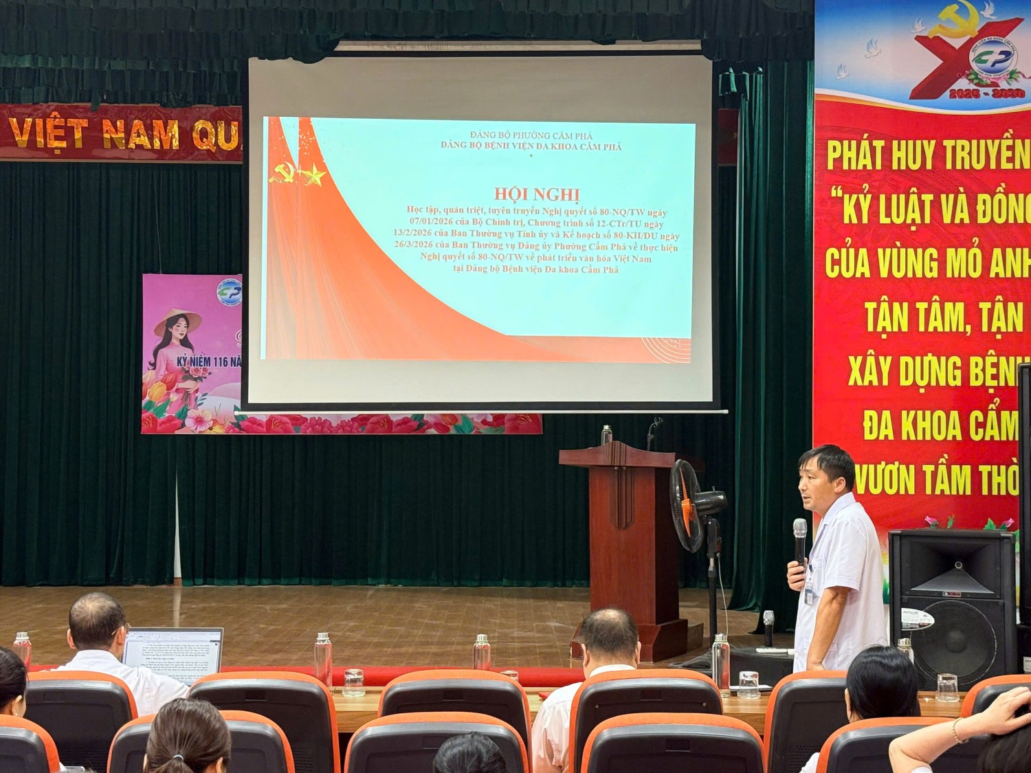 <p style="text-align:justify;text-indent:35.45pt;"><span style="font-size:14.0pt;">Chiều ngày 16/4/2026, Đảng ủy Bệnh viện Đa khoa Cẩm Phả đã tổ chức Hội nghị học tập, quán triệt và triển khai thực hiện Nghị quyết số 80-NQ/TW ngày 07/01/2026 của Bộ Chính trị về phát triển văn hóa Việt Nam, cùng các chương trình, kế hoạch của Tỉnh ủy và Đảng ủy Phường Cẩm Phả.</span></p><figure class="image"><img style="aspect-ratio:1500/1125;" src="https://benhviencampha.vn/uploads/news/2026_04/z7731853743718_84d282a1701666380dd511bb69d590a5.jpg" width="1500" height="1125" /></figure><p style="text-align:justify;text-indent:35.45pt;"><span style="font-size:14.0pt;">Hội nghị được tổ chức tại Hội trường Bệnh viện với sự tham dự của toàn thể cán bộ, đảng viên trong Đảng bộ. Đồng chí Vũ Quang Trung - Bí thư Đảng bộ Bệnh viện trực tiếp truyền đạt các nội dung trọng tâm của Nghị quyết, nhấn mạnh vai trò của văn hóa và con người là nền tảng, động lực cho sự phát triển bền vững.</span></p><p style="text-align:justify;text-indent:35.45pt;"><span style="font-size:14.0pt;">Thông qua hội nghị, cán bộ, đảng viên được nâng cao nhận thức, thống nhất về tư tưởng và hành động, góp phần đưa Nghị quyết vào thực tiễn hoạt động của đơn vị.</span></p><p style="text-align:justify;text-indent:35.45pt;"><span style="font-size:14.0pt;">Đây là hoạt động có ý nghĩa quan trọng, thể hiện quyết tâm của Đảng bộ Bệnh viện trong việc xây dựng môi trường văn hóa lành mạnh, nâng cao chất lượng phục vụ người bệnh.</span></p><figure class="image"><img style="aspect-ratio:1500/888;" src="https://benhviencampha.vn/uploads/news/2026_04/z7731853728139_3b95d07dd7951bf5b19880bc391df4f8.jpg" width="1500" height="888" /></figure>